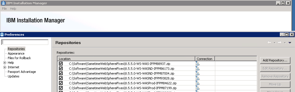 Launch Installation Manager – Choose File – Preferences from the menu and set up your repositories as I have done below (these point to the fixes which were zip files, these didn’t need to be extracted but I wanted them listed separately so I could check them)