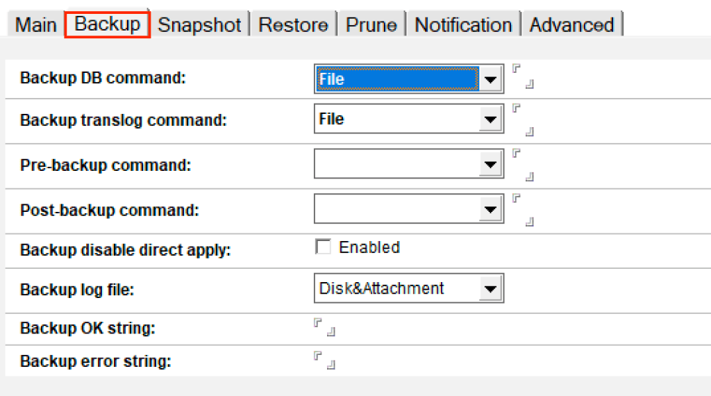 - Backup DB & translog command. We have a choice of “File” ; “Cmd Formula” ; “Agent” and “Cmd”. All but file refer to integration with 3rd party backup systems so for our purposes we are choosing “File”