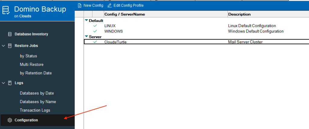 Now let’s set up a backup configuration. In the configuration view you will see two default documents, one for Linux and one for Windows. You can use these configuration documents and amend them as needed but I made a new config for the server “Clouds” as I wanted to configure its settings differently from the default ones. You don’t have to create server-specific configurations if you are happy for all servers with a replica of this database to use the same configurations.