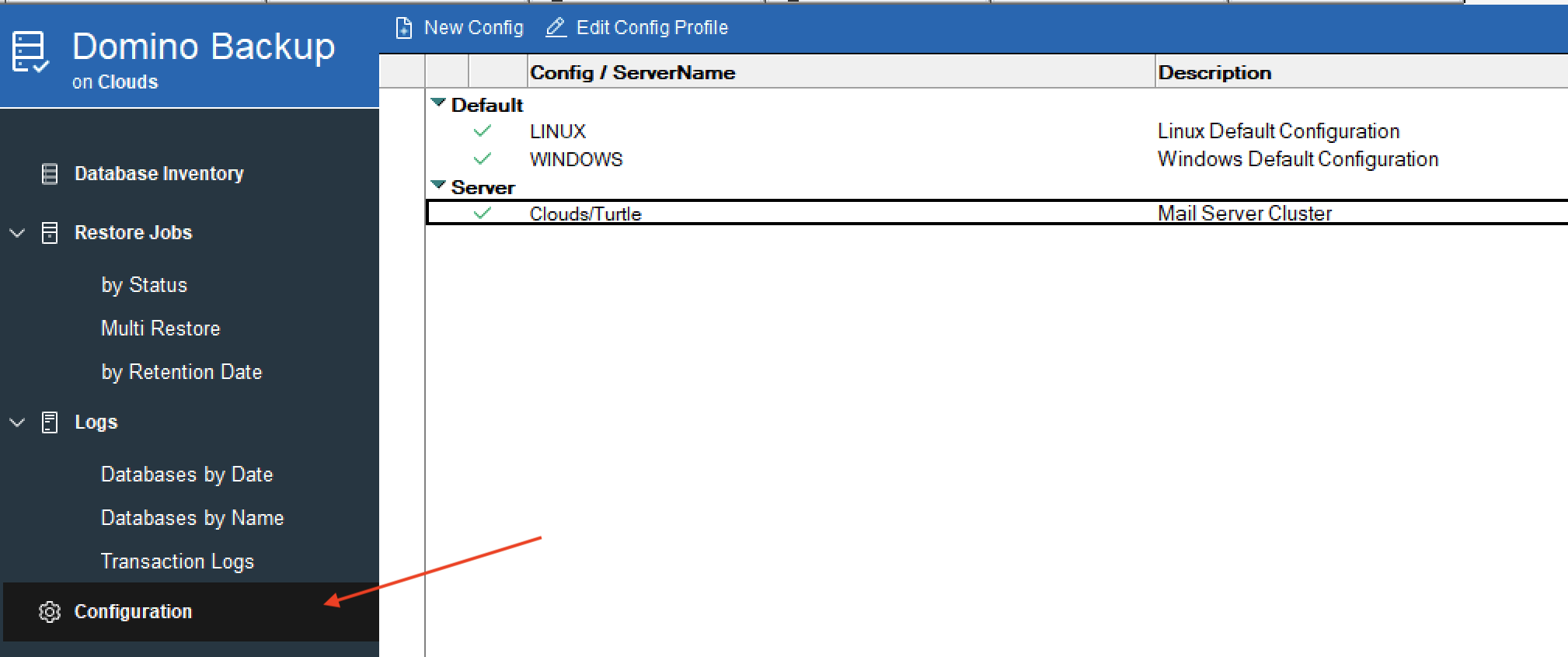 Now let’s set up a backup configuration. In the configuration view you will see two default documents, one for Linux and one for Windows. You can use these configuration documents and amend them as needed but I made a new config for the server “Clouds” as I wanted to configure its settings differently from the default ones. You don’t have to create server-specific configurations if you are happy for all servers with a replica of this database to use the same configurations.