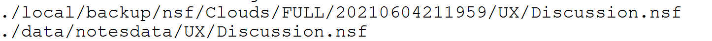 Now if I search my file system for Discussion.nsf I find the original database in /data/notesdata/UX, the backup copy in /local/backup/nsf and the restored copy (replica) in /data/notesdata/restore