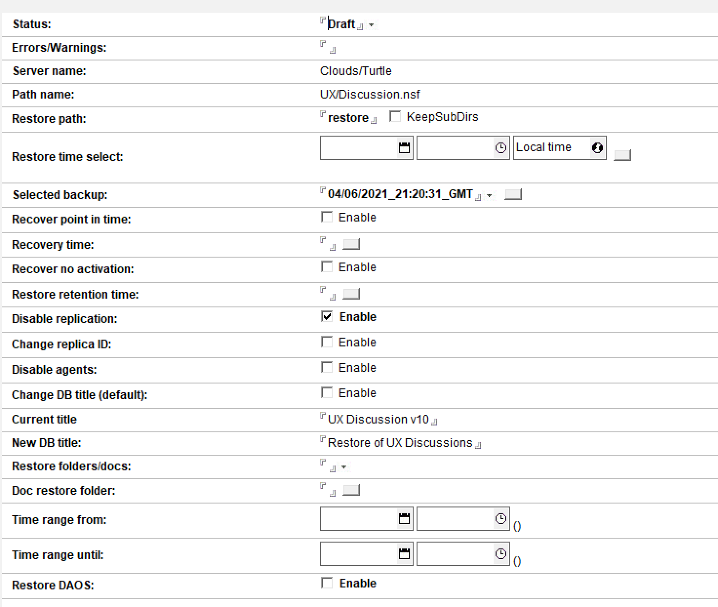 - The only setting I have to choose is which backup I want to restore from, as the system assumes there are multiple backups taken over a period of time. There are two ways of selecting a backup either by a date range in which case the newest backup within that range is restored, or by bringing up the dialog for the field “Selected Backup which will give me the option to restore any backups available for the database that dominobackup.nsf knows about. In this instance there is only one so I select that.