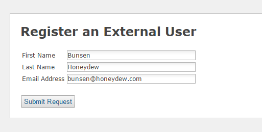 Then generates a unique registration code that can be emailed out to the external user manually (or automated if you want to add that code)